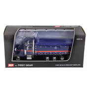 This blue and orange 1/64 scale Peterbilt 379 dump truck is made by First Gear. The dump truck features a quad-axle MAC dump truck body with a removable tarp. The truck features include opening hood with authentic engine detail, poseable front wheels, accurately detailed cab, functioning trailer bed that can raise and lower, and opening trailer door. The truck is made from diecast metal with detailed plastic and rubber wheels. This item is recommended from the manufacturer for ages 14+ years and up.