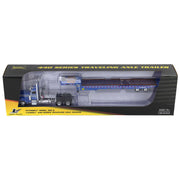 The 1/64 scale truck and trailer feature matching blue decoration. This semi truck boasts incredible attention to detail, including hoses, authentic decals, conspicuity stripes and more.