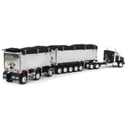 Made by Frist Gear, this is the 1/64 Black/Chrome Kenworth T800 w/ Chrome East Genesis II End Dump Trailers. An exclusive DCP dealer run, only 504 made. Created using the New East Genesis II Michigan tooling! Features for the diecast metal replica include 38" sleeper, 252" wheelbase, dual air cleaners, polished metal hump fenders, door mounted chromo mirrors, heavy front steer rims, newly designed cylinder to represent actual height while trailer is in the raised position, electric rollover tarp assembly, front door and rear grain door, and chrome rock guards. Recommended for ages 14+, display only, not intended for play.