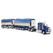 Made by Frist Gear, this is the 1/64 Blue/Chrome Kenworth T800 w/ Chrome East Genesis II End Dump Trailers. An exclusive DCP dealer run, only 504 made. Created using the New East Genesis II Michigan tooling! Features for the diecast metal replica include 38" sleeper, 252" wheelbase, dual air cleaners, polished metal hump fenders, door mounted chromo mirrors, heavy front steer rims, newly designed cylinder to represent actual height while trailer is in the raised position, electric rollover tarp assembly, front door and rear grain door, and chrome rock guards. Recommended for ages 14+, display only, not intended for play.