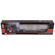 This Kenworth semi truck replica with Wilson livestock trailer boasts a beautiful burgundy and black color scheme. This 1/64 scale die-cast metal semi is made by DCP by First Gear. According to the manufacturer, this replica is recommended for ages 14+ years, meaning it is for display only and not for play.