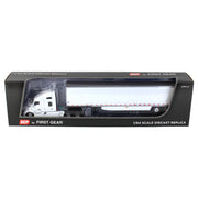 This DCP by First Gear replica boasts die-cast metal construction with meticulous detailing, incorporating some plastic components and authentic rubber tires. The classic white decoration enhances the truck's sleek appearance.