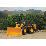 This authentic Komatsu WA900-3 Wheel Loader diecast metal replica model features an adjustable loader arm and tilting load bucket, accurately detailed cab interior, articulating chassis steerability, oscillating rear axle and vinyl tires. This quality replica is decorated with a yellow paint scheme. This 1/50 scale replica measures approximately 11.25" long, 3.75" wide, and 4" high.