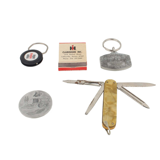 View full detailsLot of (2) Key Chains, (1) Medallion, (1) Pocket Knife, and (1) Matchbox