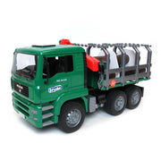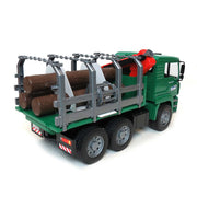 The MAN Timber Truck with Loading Crane By Bruder is unmatched in quality, material and design. It gives the child a view of the motor unit when the cab is tilted up. This Timber Truck has swing-out mirrors and soft rubber tread tires. Bruder designed this timber truck/crane to work just like the real thing. It comes with 3 plastic trunks that resemble real forest tree trunks. The platform on this Timber Truck has hinged side-stakes that release for easy load and unloading.This MAN Timber Truck is made with the typical Bruder high quality plastic and excellent detail.