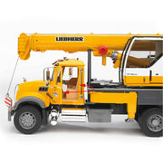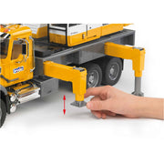 The impressive Liebherr crane truck literally towers above the BRUDER range of utility vehicles. When the telescopic length is extended, the crane truck is already of considerable height and can be extended even further with an additional boom. Our small customers will be impressed because when the crane boom is at full length with the additional attachment and fully raised, it is 1.3 m high and will tower above some of the little builders. Given the size, it must naturally also be stable. A high level of stability to prevent the crane truck tipping over is achieved with the swiveling and individually-adjustable support legs of the vehicle platform. For even greater stability, the installed counterweight can be used – just like an original crane. To ensure it is heavy enough, it can be filled with sand. BRUDER's slogan `multifunctional´ is particularly evident in this model. A newly developed cable winch with a locking device and overload protection make it very easy to get to grips with the crane hook, even when lifting and lowering large parts. Our love of detail extends to the crane operator's cab too. Just like the original, it has a pane protection frame and a sliding door which opens. A tool compartment integrated into the platform completes the many functions of the crane. The Mack cab is just as impressive. With its numerous chrome parts and the large bonnet, it embodies the American way of life. A truck with many functions like the bonnet and doors which open.