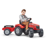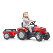 This is a Massey Ferguson 8740S Pedal Tractor with Trailer. It is made with quality durable plastic by Falk! This play pedal tractor is great for outdoor play and imagination. The included trailer is detachable from the tractor. According to the manufacturer, this pedal tractor with trailer is recommended for ages 3-7 years old with a maximum weight capacity of 110lbs. Measures approximately 63.78in x 22.83in x 25.98in.