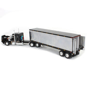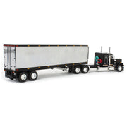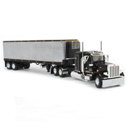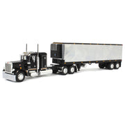 Introducing an exclusive DCP by First Gear 1/64 scale Peterbilt Tractor Trailer replica! This 1/64 scale semi is comprised of a Peterbilt Model 359 truck and a 40 foot vintage box trailer. Both the truck and trailer boast sleek black and chrome decoration, as well as a plethora of exceptional details that are sure to impress even the most avid collector. The Peterbilt truck is equipped with a 36 inch flat top sleeper cab, and the vintage trailer is equipped with a reefer. Measuring approximately 13.5in L x 1.75in W x 2.5in H, this diecast metal semi truck is gearing up to be the perfect display model or farm toy display feature.