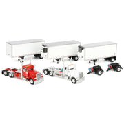 This incredibly unique set features two highly-detailed Peterbilt 379 day cab trucks paired with three matching pup trailers and two dollies, which together create an authentic and versatile multi-trailer display experience. One truck is finished in red decoration and the other in white, complemented by white-decorated trailers, all crafted from diecast metal with select plastic components. True-to-scale details such as colored air hoses, mirrors, conspicuity stripes, and much more brings exceptional realism to this truck set.