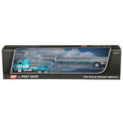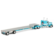 This 1/64 scale die-cast metal replica is made by First Gear, Inc. and is part of the DCP by First Gear replica truck fleet. This model replicates a Peterbilt Model 379 Truck paired with a Transcraft Step Deck Trailer. The Peterbilt is equipped with a 48 inch flat top sleeper cab. Both the truck and trailer showcase beautiful teal decoration.