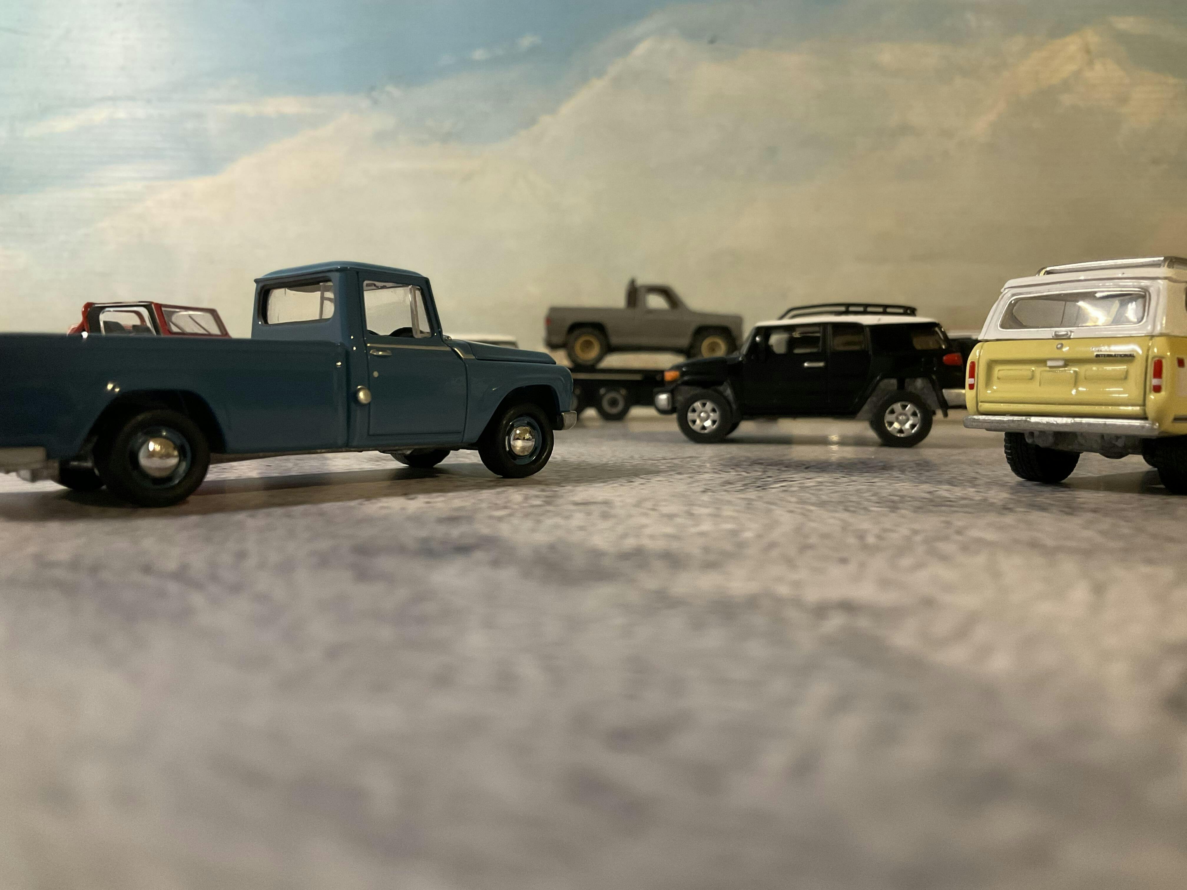 - Two (2) pack comes with one (1) blue 1965 International 1200 Pickup Truck and one (1) yellow/white 1979 International Scout SUV