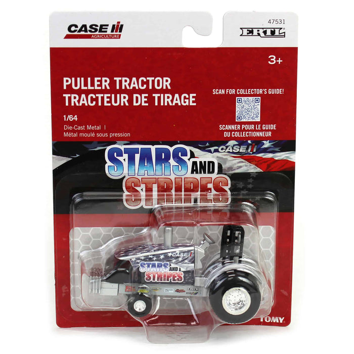 Made by ERTL this 1/64 Case IH Magnum Pulling Tractor features a "Stars & Stripes" color scheme and is made of a diecast metal construction. The pulling tractor is a limited edition silver chase unit. This piece features roll bar, oversized tires, and a beautiful decoration. Recommended for ages 3+.