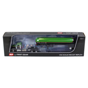 Made by First Gear, this black and green 1/64th Kenworth W900L day cab is paired with an Anhydrous tank trailer. The truck and trailer features an opening hood with authentic engine detail, accurately detailed cab interior, poseable front wheels, pivoting fifth-wheel for trailer attachment, working landing gear, detailed undercarriage and chassis. Made from diecast metal with rubber wheels, some plastic parts. Manufacturer recommended for ages 14+ years. Not recommended for play.