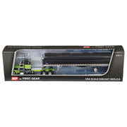 Add a standout piece to your collection with this Peterbilt 389 Semi Truck Replica paired with a Wilson Patriot Belt Trailer, a premium 1/64 scale diecast model built for serious collectors. Featuring a striking lime green and black paint decoration, this highly detailed Peterbilt 389 showcases a realistic 48-inch standup sleeper cab, authentic proportions, and finely tooled details throughout. The matching Wilson Patriot belt trailer replica completes the look, making this semi truck and trailer combo perfect for display. Manufactured by DCP by First Gear, this model is constructed from diecast metal with select plastic components for durability and realism. Designed for ages 14 and up, this collectible diecast semi truck replica is ideal for shelves, dioramas, or farm toy displays and is not intended for play—a must-have addition for fans of Peterbilt trucks, Wilson trailers, and 1/64 scale diecast collectibles.