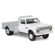 This 1/64 scale 1985 Dodge Ram W350 Dually Flatbed Pickup Truck is a Diecast Direct Exclusive, crafted by Greenlight Collectibles. It features a white body with a silver flatbed and includes a diecast metal build, rubber tires, and select plastic components for added detail. The truck measures approximately 3.25 inches in length, 1.5 inches in width, and is recommended for collectors age 14+.