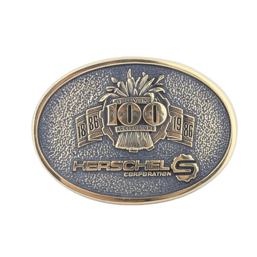 Vintage Herschels Corp. Belt Buckle 100 years of serving Agriculture decoration Made in the USA Material: Solid Brass Approximate dimensions: 3.5i...