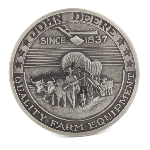 John Deere Quality Farm Equipment Since 1837 belt buckle Pewter colored finish Material: Metal Approximate dimensions: 2.4in W Age Grade: Adult Du...