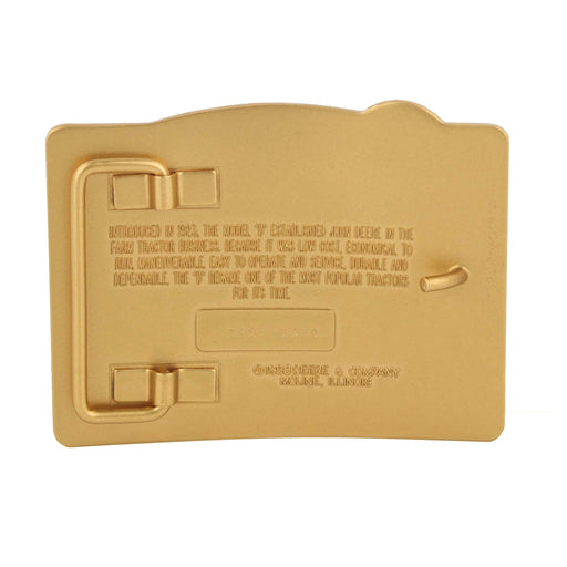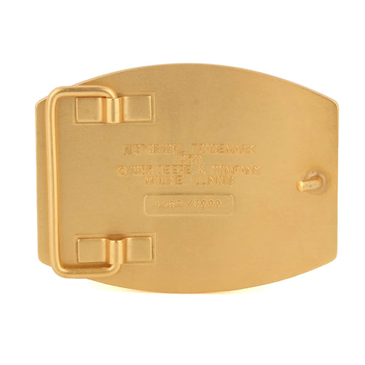John Deere 1950 trademark belt buckle Gold plated finish Serialized out of 6000 Material: Metal Approximate dimensions: 3.0in L x 2.25in W Age Gra...