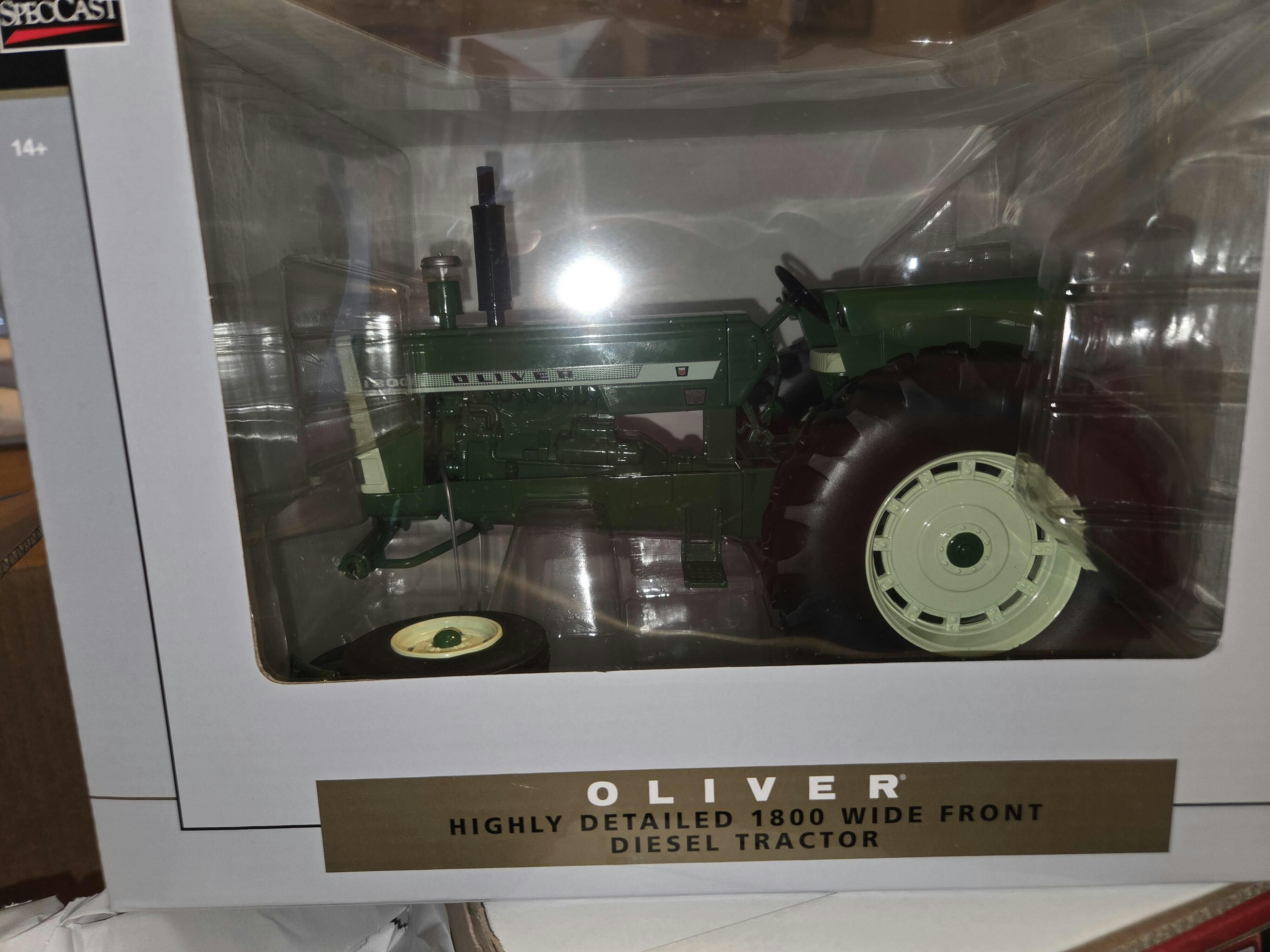 Made by SpecCast, this 1/16 scale Oliver 1800 diesel wide front tractor is highly detailed and very fragile. The Oliver tractor features an open station with accurate details, poseable front wheels, and a 3-point hitch. The tractor is made from diecast metal with some plastic parts and rubber wheels. Per the manufacturer, it has a recommended age of 14+ years and is not recommended for play.
