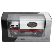 This authentic 1953 White 3000 COE Delivery Van diecast metal replica model features an accurately detailed cab interior, chrome-plated accessories, detailed chassis and undercarriage. This quality replica is decorated with a white and red paint scheme. This 1/34 scale replica measures approximately 8.25" long, 3" wide, and 4.25" high.