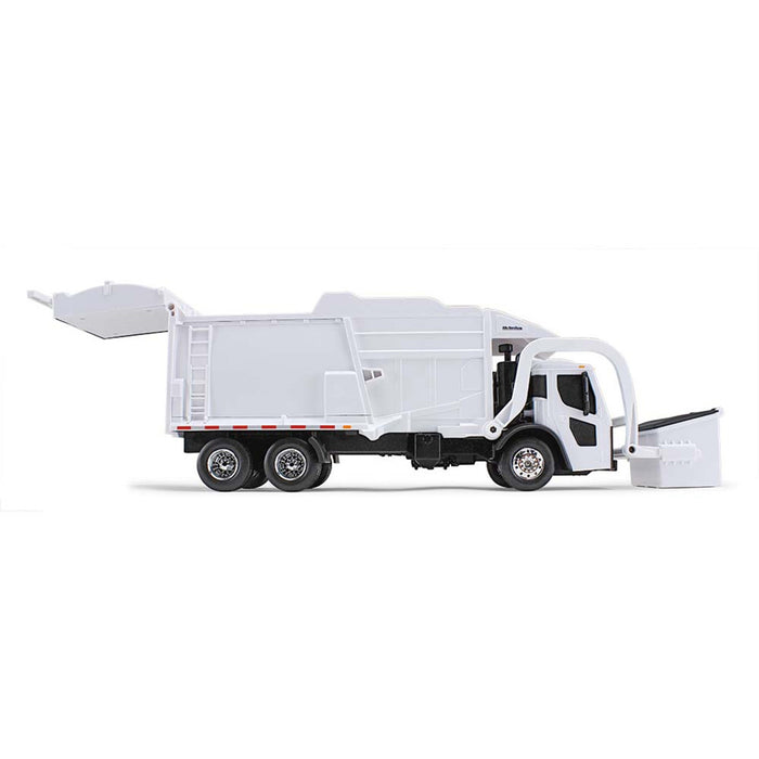 This authentic Plastic Mack® LR with McNeilus® Meridian™ Front Load Refuse Truck & Bin including Lights & Sounds replica model features manually moving front loader arms engage lights and lighting/dumping sounds, opening rear refuse door, and activation buttons on the top include lights and engine sound, lights only, and backup beeping sound and flashing rear lights. Batteries are included. This quality replica is decorated with a white paint scheme. This 1/25 scale replica measures approximately 15.75" long, 4.75" wide, and 7" high.