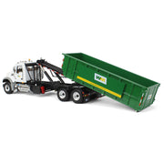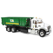 This authentic Mack® Granite® MP with Ribbed Roll-Off Container and Large Signboard diecast metal replica model features an opening hood with authentic engine detail, accurately detailed cab interior, authentically functioning roll-off frame slides and tilts, removable roll-off container, detailed chassis and undercarriage. This quality replica is decorated with a white and green paint scheme. This 1/34 scale replica measures approximately 12.5" long, 3.5" wide, and 3.5" high.