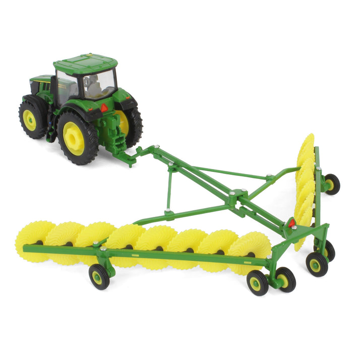 Bring the hay harvesting to your home collection with this 1/64 scale John Deere Haying Set by ERTL! It includes a John Deere 7R 250 tractor, John Deere 561R baler, John Deere W235R self-propelled windrower, green hay rake and 6 bales. This set is made of die-cast metal with some plastic components. According to the manufacturer, this toy set is recommended for ages 8+ years.