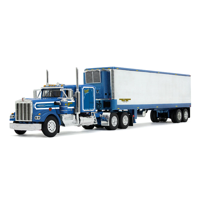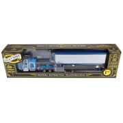 Introducing the 2nd release in DCP by First Gear's new Legacy Series: the Western Distributing “Crippled Cowboy” semi truck! This 1/64 scale die-cast metal model replicates a Kenworth W900A Truck paired with a 40ft Vintage Trailer. The Peterbilt is equipped with a 60 inch flat top sleeper cab, and the trailer is equipped with a reefer. Both the truck and trailer showcase matching Western Distributing “Crippled Cowboy” decoration.