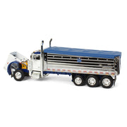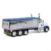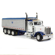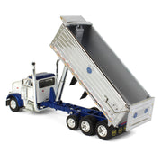 This 1/64 scale white and blue Peterbilt 379 dump truck is made by First Gear. The dump truck features a MAC dump body with a tri-axle. The truck other features include an opening hood with detailed engine, rear tri-axle, function dump trailer with opening trailer door, and removable bed cover. The truck is made from diecast metal with detailed plastic and rubber wheels. This item is recommended from the manufacturer for ages 14+ years and up.