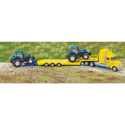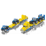 The 1/87 New Holland Tractor Trailer is a miniature replica of the real-life agricultural powerhouse. This set features two T7070 New Holland tractors, each intricately detailed with realistic features. The trailer boasts a New Holland yellow paint scheme with a pivoting fifth-wheel, allowing seamless attachment and detachment. Its functioning ramps add an interactive element, enabling easy loading and unloading of cargo. The model is constructed with high-quality die-cast materials, ensuring durability and authenticity. Rubber wheels provide smooth movement while the strategic use of plastic parts enhances the overall aesthetic. This 1/87 scale New Holland Tractor Trailer set is perfect for collectors, enthusiasts, and anyone fascinated by agricultural machinery.