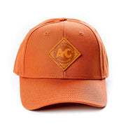 - Solid burnt orange cap displaying the vintage starburst Allis Chalmers logo on a leather emblem