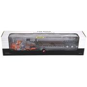 This authentic Peterblit® Model 367 diecast metal replica comes paired with a Talbert® 55SA Lowboy trailer and features an opening hood with authentic engine detail, opening doors with accurately detailed cab interior, pivoting fifth-wheel for trailer attachment, detailed chassis and undercarriage. This quality replica is decorated with an orange and black paint scheme. This 1/50 scale replica measures approximately 17.5" long, 2.25" wide, and 2.75" high.