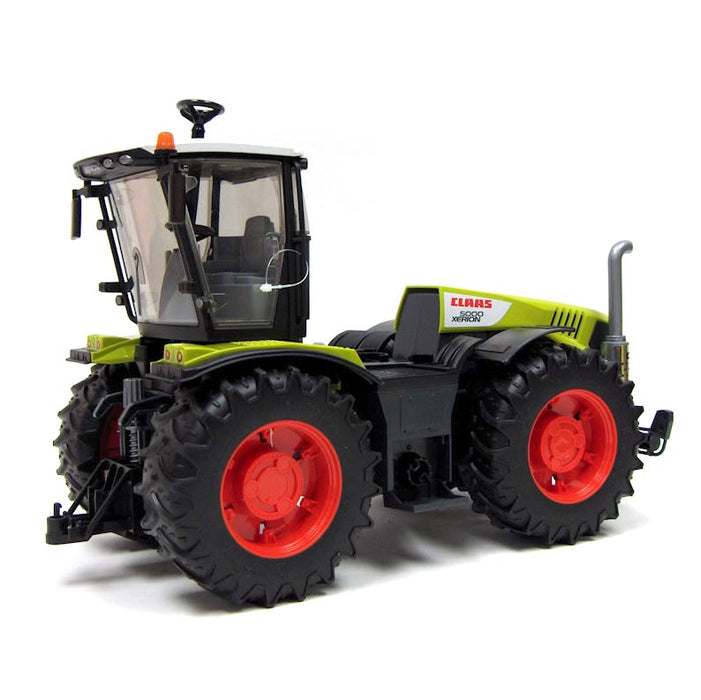 The power packed into the Claas Xerion 5000 is obvious at first glance. Its shear force becomes apparent by merely looking at its design and the wheels which are all of the same size. However, when developing the original of this vehicle, the manufacturer sought to combine this power with intelligent solutions that make the vehicle versatile enough to be used for a variety of applications. This is why the Xerion is described by Claas to possess "intelligent power." As you have come to expect from BRUDER Spielwaren, the model of this original possesses the exact same properties. True to our objective, we developed features for this model - just as for our other models - that can also be found in the original while being unique for a toy. These features include the wheels that BRUDER designed in such a way that they can be steered through the sliding cab roof and clip-on steering column, while the cab can be rotated without interrupting the transmission connection. Just as in the original, it is possible to steer all 4 wheels simultaneously. During normal use, all wheels are steered while counter-rotating to achieve the smallest possible turn radius. Another unique feature is the offset driving (crab steering) of the original which can be re-enacted by operating an adjusting mechanism attached to the chassis. Apart from these particularities, this tractor stands out from the crowd by features one has come to expect from large BRUDER tractors and which include the glazed cabin with doors that can be opened or the height adjustable rear coupling.
