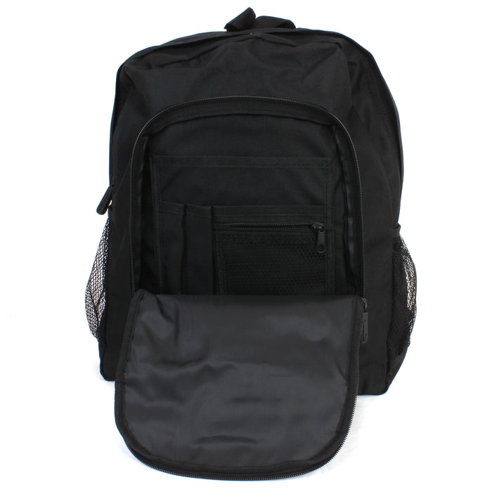 This is a youth size IH Logo Backpack! Made of high-quality 100% Nylon material. Features include mesh side pockets, large zipper compartment, front zipper compartment with pencil slots and coin pouch, and padded reflective safety straps. Straps are fully adjustable  to find that perfect fit with ease. This is an officially licensed Case IH product. It has approximate dimensions of 18in x 12in. Hand wash only.