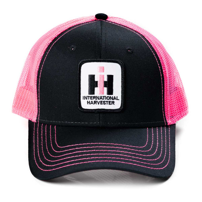 This IH logo cap has a solid black front, black bill with pink stitching, and hot neon pink mesh back. The IH logo is woven stitched in to give it durability. The I is pink on a black H inside white background. The cap is a low-profile, unstructured with a curved bill and contrast stitching. The cap has a plastic snap closure. One size fits most adults.