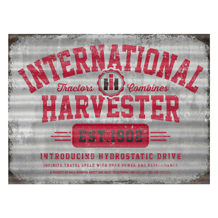 This is an International Harvester Corrugated Tin Sign. Its dimensions are approximately 23.5in L x 17.5in W. This sign is intended for indoor use, not intended for the use outdoors. The sign reads “International Harvester IH Tractors Combines, EST. 1902, Introducing Hydrostatic Drive- Infinite Travel Speed With Peak Power And Performance- A Product of Hard Working Americans Built To Outwork And Outstand The Competition.”
